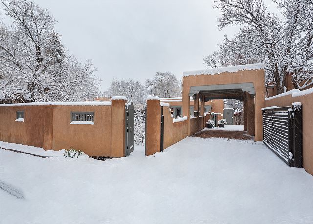Hidden behind adobe walls, with a private front garden of old-time roses, along the original Acequia of Santa Fe... as it winds its way through one of the city's most historic and sought-after streets...the beloved "Acequia Madre"...