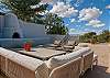The Master bedroom has a King Size Canopy Framed Bed. Near the Bed, there is a ‘Skycove’ nook window box where you can enjoy the nightly sunsets or watch the weather. It has a cozy candle-filled fireplace. The master bathroom has a walk-in Shower, a walk-through master closet, double sinks, and a freestanding tub with vast views of the surrounding hills. Double French doors lead to the main entertaining patio.
