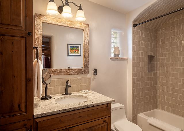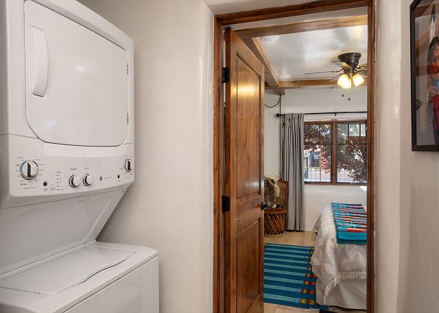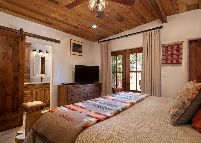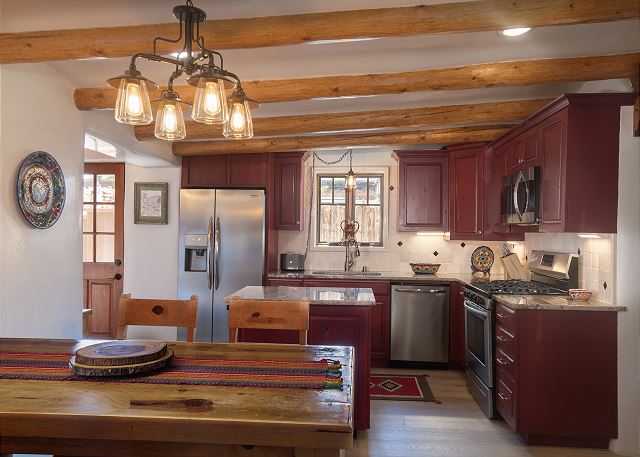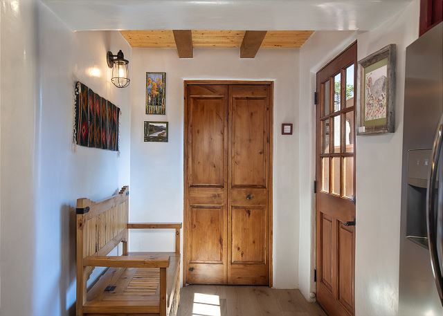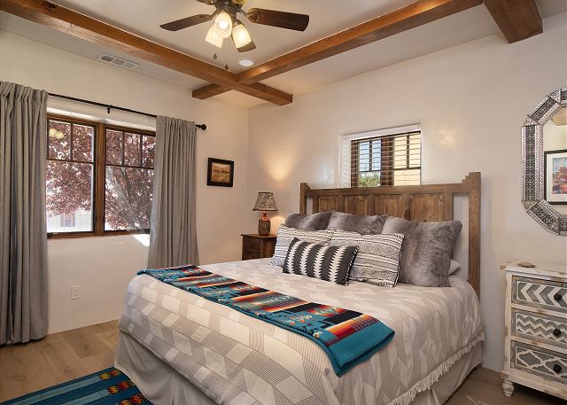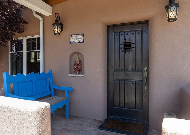Additional amenities include diamond finish plaster walls, forced-air heating and refrigerated A/C, engineered wood and tile floors, a pro-panel roof, recessed lighting, wood doors, ceiling fans, drip irrigation, and covered front and rear porches for year-round outdoor living. This home beautifully blends modern comfort with authentic Southwestern architecture, offering a rare opportunity to live in one of Santa Fe’s most desirable neighborhoods. Available for 30+ day rentals, it is perfectly suited for extended stays in Santa Fe—whether you’re here for work, a seasonal retreat, or simply to immerse yourself in the city’s vibrant culture. With its prime location near the Railyard, Santa Fe Plaza, art galleries, and world-class dining, plus all the comforts of a fully appointed home, it delivers an effortless and inviting long-term rental experience.