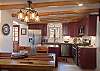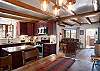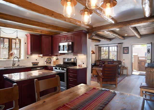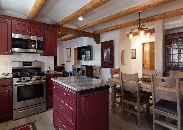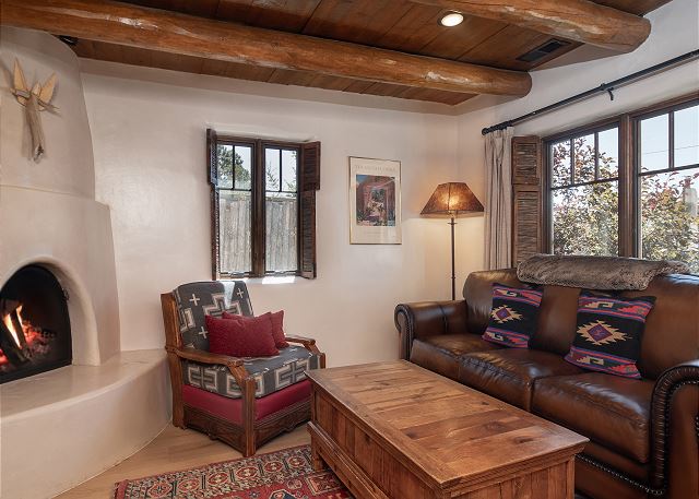 Inside, the living room with a traditional kiva wood-burning fireplace features wood vigas, tongue-and-groove ceilings, and built-in nichos, creating the quintessential Santa Fe style. The chef’s kitchen is equipped with granite countertops, stainless steel appliances, a large island, pantry, and custom cabinetry with soft-close drawers, plus a dining room with coved ceilings and vigas.
