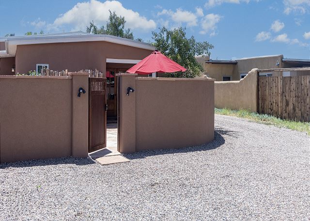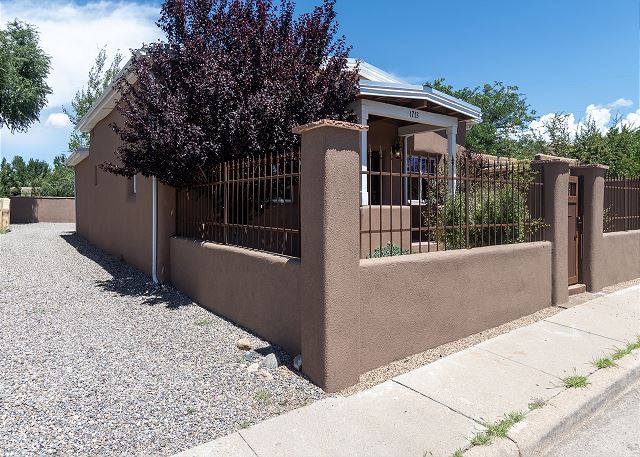 Discover Santa Fe living in this charming 2 bedroom, 2 bath single-family home located just steps from the Railyard District, Farmers Market, art galleries, award-winning restaurants, and the historic Santa Fe Plaza. This highly walkable location offers the perfect blend of convenience and Southwest charm. Enter through a welcoming front courtyard with a white picket fence, mature landscaping, and vibrant plantings. The spacious lot includes ample private parking at the rear of the home—an uncommon feature in this central location.